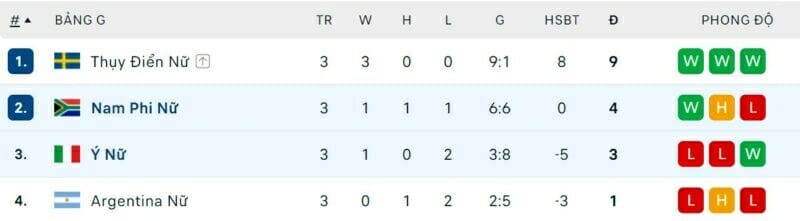 Sau 3 lượt trận, nữ Thụy Điển giành ngôi nhất bảng với 9 điểm tuyệt đối, ghi 9 bàn và chỉ thủng lưới duy nhất 1. Nữ Nam Phi xếp thứ 2 với 4 điểm, ghi 6 bàn và thủng lưới 6. Nữ Italia bị loại đầy cay đắng với 3 điểm, xếp thứ 3. Trong khi nữ Argentina chỉ có duy nhất 1 điểm và xếp chót bảng.