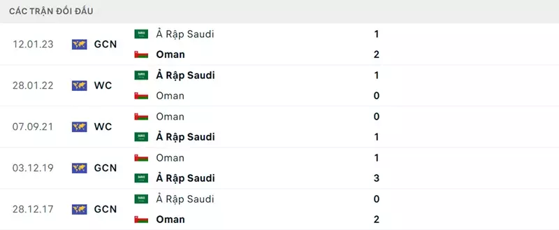 Về thành tích đối đầu, 2 đội gặp nhau 23 lần trên mọi đấu trường và sẽ có lần đầu đụng độ tại Asian Cup. Ả Rập chiếm thế thượng phong trong những lần gặp nhau này với 14 chiến thắng. Oman có 6 lần ca khúc khải hoàn và hòa Ả Rập 3 trận. Tuy nhiên, xét ở những lần chạm mặt gần nhất, Oman cho thấy sự tiến bộ vì không còn để cho Green Falcons lấn át. Cụ thể, Bầy chim ưng xanh chỉ thắng 3/12 trận gần nhất.