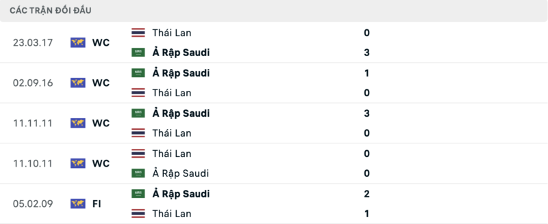 Thành tích đối đầu Ả Rập Xê Út vs Thái Lan