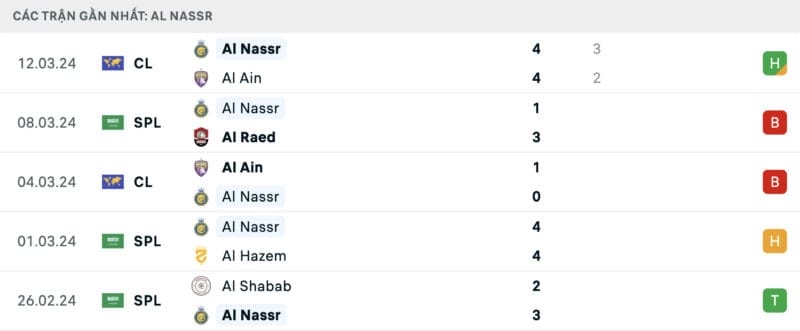 Trái ngược với đối thủ, Al Nassr đang có phong độ rất tệ. Sau 3 trận toàn hòa và thua, thầy trò HLV Luis Castro cuối cùng cũng biết thắng khi vượt qua Al Ain với tỉ số 4-3 ở trận lượt về tứ kết AFC Champions League, qua đó cân bằng tỉ số sau 2 lượt trận. Dù vậy chiến thắng này chẳng hề có ý nghĩa gì bởi Al Nassr đã bị loại đầy cay đắng ở loạt sút luân lưu.