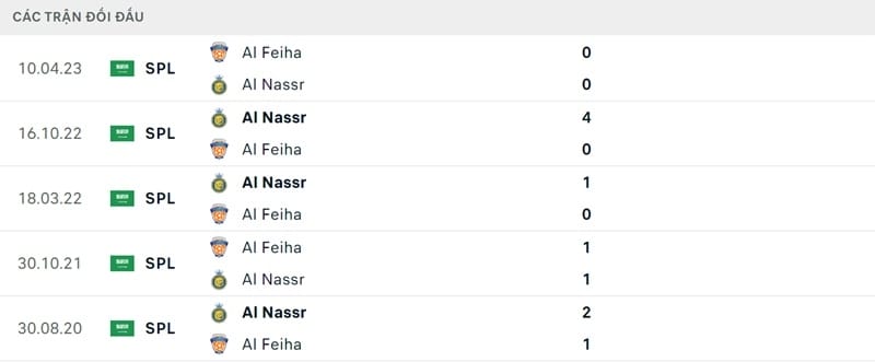 Thành tích đối đầu Al Feiha vs Al Nassr:
