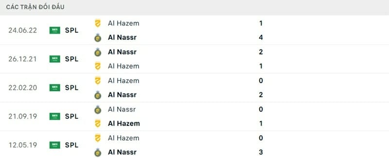 Thành tích đối đầu Al Hazem vs Al Nassr