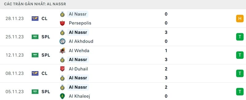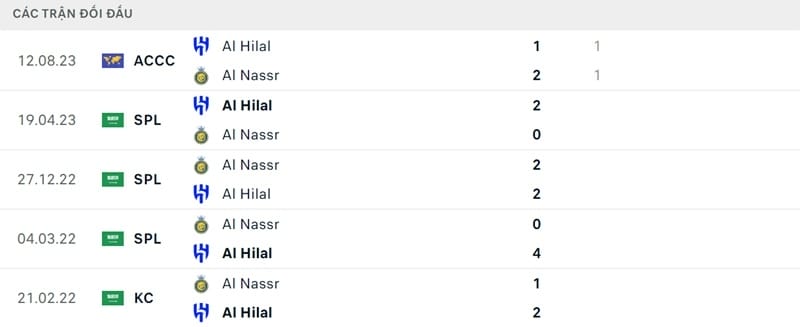Thành tích đối đầu Al Hilal vs Al Nassr: