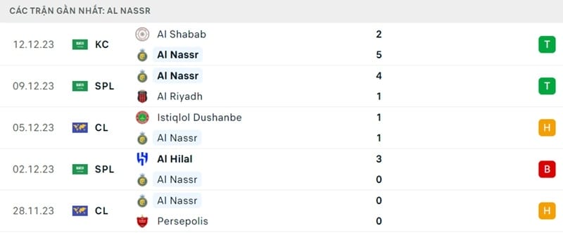 Phong độ gần đây Al Nassr vs Al Ettifaq: