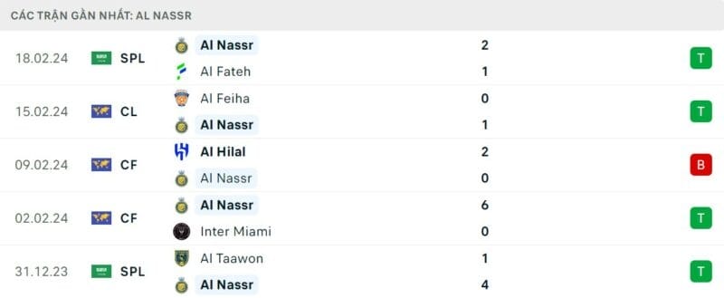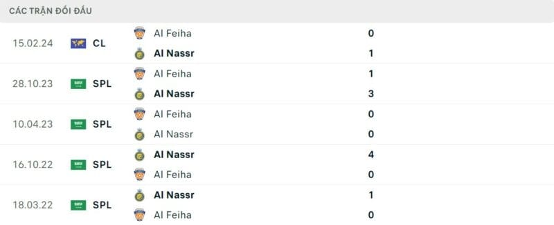 Thành tích đối đầu Al Nassr vs Al Fayha
