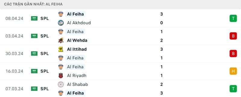 Trong khi đó, Al Feiha vừa chấm dứt chuỗi 3 trận không thắng bằng việc hạ gục ứng cử viên xuống hạng Al Akhdoud trên sân nhà. Màn hủy diệt 3-0 đó đồng nghĩa Al Feiha bỏ túi 2 thắng, 1 hòa và 2 thất bại trong 5 lần ra sân mới đây. CLB hiện tích góp được 35 điểm sau 27 trận, tức vượt qua Al Khaleej để giữ vị trí thứ 9. Thầy trò HLV Vuk Rasovic bằng điểm với Damac FC nhưng xếp sau vì thua hiệu số bàn thắng bại.