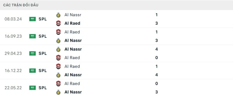 Thành tích đối đầu Al Nassr vs Al Raed