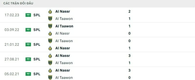 Thành tích đối đầu Al Nassr vs Al Taawon: