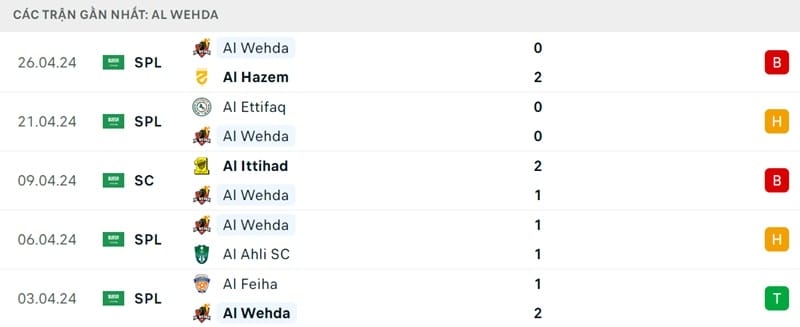 Thành tích đối đầu cũng ủng hộ thầy trò HLV Luis Castro. Sau 7 lần đụng độ gần nhất, Al Nassr thắng 5, hòa 1 và nhận 1 thất bại. Điều đó chỉ ra đại diện thành Riyadh rất biết cách át vía đội khách. Đặc biệt hơn cả, thành tích thi đấu trên sân Al Nassr của Al Wehda cũng rất tệ hại. Họ thua tận 10, thắng 4 và hòa 2 sau 16 trận.