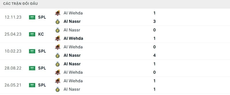 Thành tích đối đầu Al Nassr vs Al Wehda