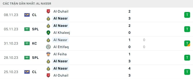 Al Nassr tiếp tục duy trì thành tích ấn tượng với 17 trận liên tiếp bất bại ở mọi đấu trường. Ở trận đấu gần nhất với Al Duhail tại AFC Champions League, họ giành chiến thắng 3-2 dù không có Cristiano Ronaldo trong đội hình.