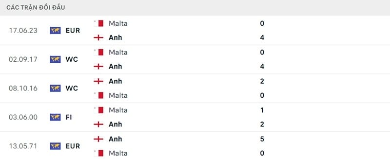 Thành tích đối đầu Anh vs Malta:
