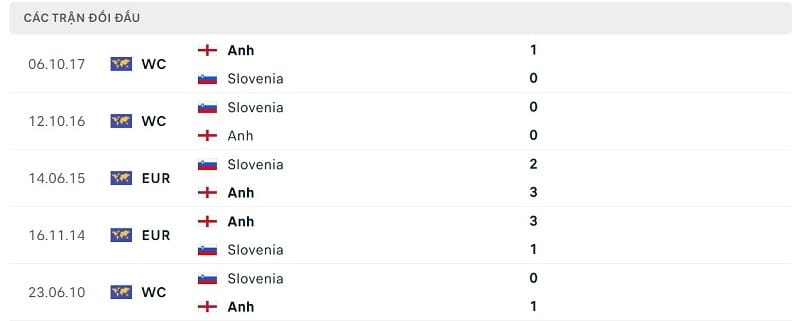 Thành tích đối đầu Anh vs Slovenia