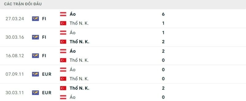 Thành tích đối đầu Áo vs Thổ Nhĩ Kỳ