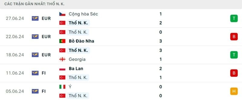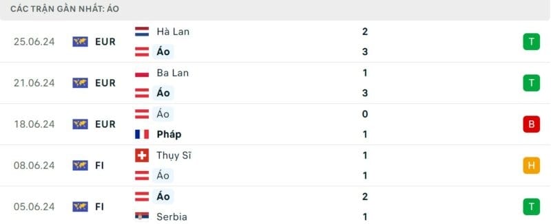 Phong độ gần đây Áo vs Thổ Nhĩ Kỳ