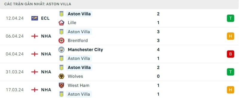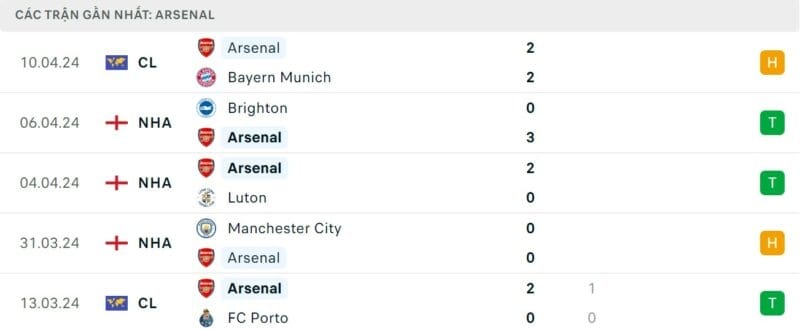 Phong độ gần đây Arsenal vs Aston Villa