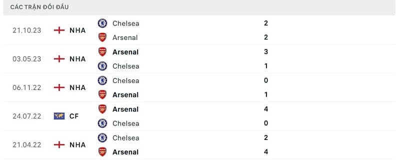 Thành tích đối đầu Arsenal vs Chelsea