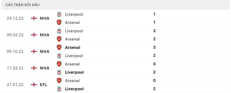 Thành tích đối đầu Arsenal vs Liverpool