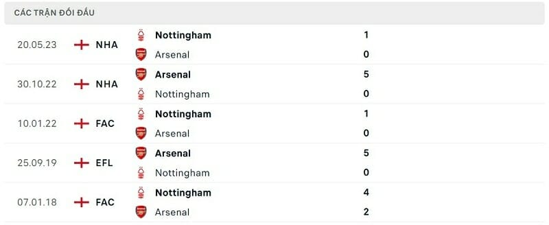 Thành tích đối đầu Arsenal vs Nottingham Forest: