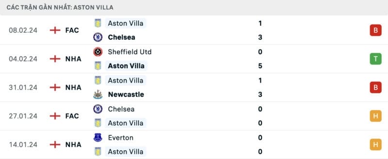 Tại Ngoại hạng Anh, thầy trò HLV Unai Emery cũng chỉ giành một chiến thắng trong 3 trận gần nhất. Đó là chiến thắng tưng bừng 5-0 trước Sheffield United ở vòng đấu trước. Kết quả này giúp Aston Villa chiếm lĩnh vị trí thứ 4 từ tay Tottenham với 2 điểm nhiều hơn.
