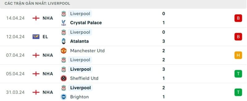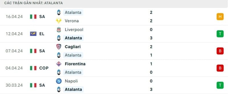 Phong độ gần đây Atalanta vs Liverpool