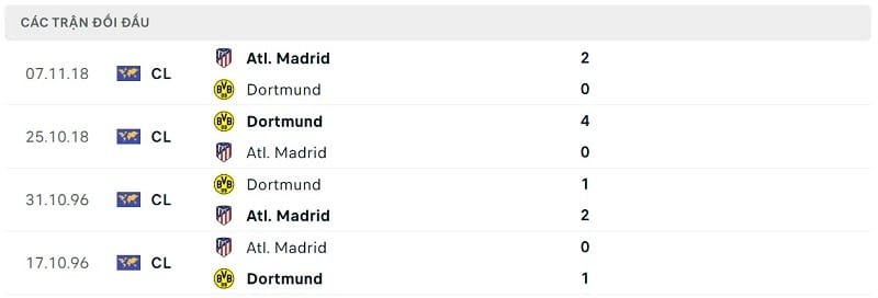 Thành tích đối đầu Atletico Madrid vs Dortmund