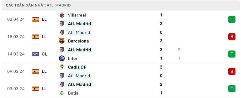 Ở trận đấu gần nhất, Atletico Madrid đã giành chiến thắng với tỷ số 2-1 trước Villarreal nhờ các bàn thắng của Axel Witsel cùng Saul Niguez. Kết quả này giúp Los Rojiblancos có thêm 3 điểm đầy quý giá trong cuộc đua vào top 4 La Liga 2023/24. Đoàn quân của HLV Diego Simeone hiện có 58 điểm, đứng thứ 4 trên bảng xếp hạng và hơn đội xếp sau là Athletic Bilbao 2 điểm.