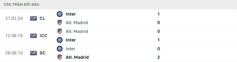 Thành tích đối đầu Atletico Madrid vs Inter Milan