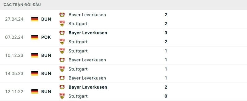 Thành tích đối đầu Bayer Leverkusen vs Stuttgart