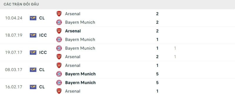 Thành tích đối đầu Bayern Munich vs Arsenal