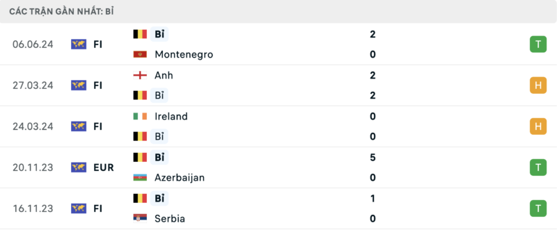 ĐT Bỉ dễ dàng vượt qua vòng loại Euro bằng thành tích bất bại. Họ thắng 6 và hòa 2 sau 8 trận đấu vòng loại. Với những ngôi sao trong đội hình như Kevin de Bruyne hay Romelu Lukaku, Bỉ được xem là một trong những ứng viên có thể tiến sâu tại Euro 2024.