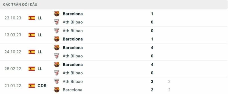 Thành tích đối đầu Bilbao vs Barca