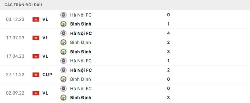 Thành tích đối đầu Bình Định vs Hà Nội