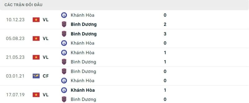 Thành tích đối đầu Bình Dương vs Khánh Hòa