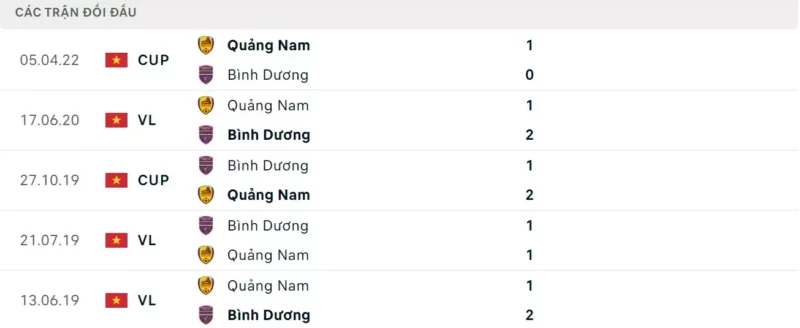 Thành tích đối đầu Bình Dương vs Quảng Nam: