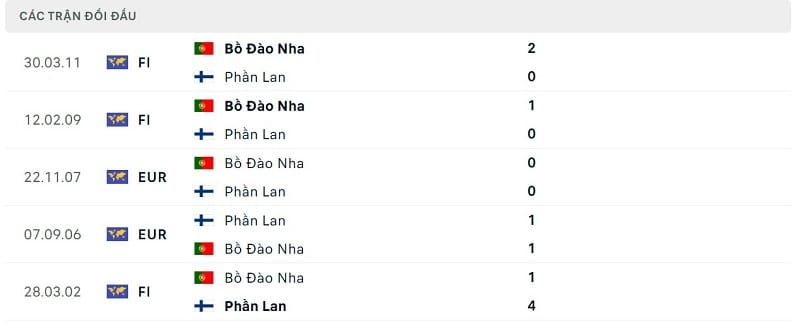 Thành tích đối đầu Bồ Đào Nha vs Phần Lan