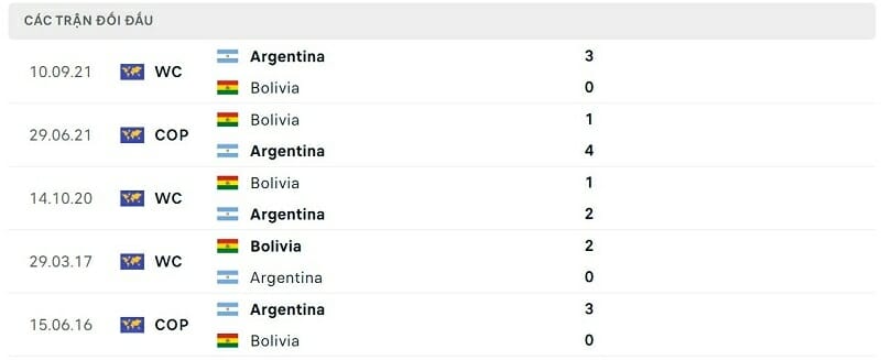 Thành tích đối đầu Bolivia vs Argentina: