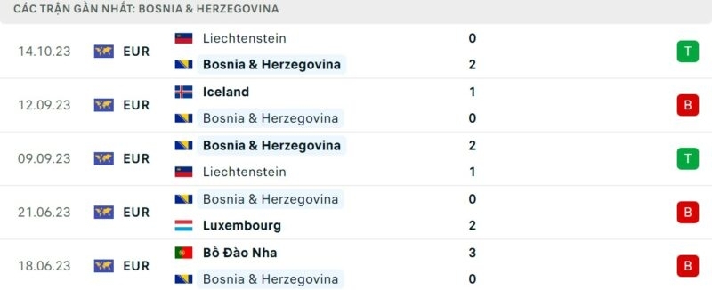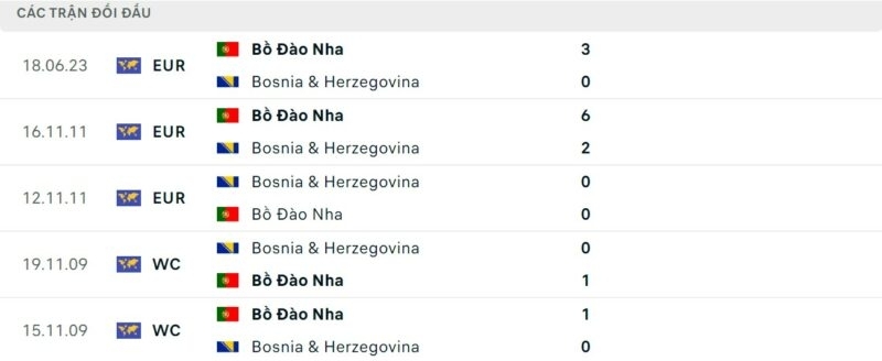 Thành tích đối đầu Bosnia vs Bồ Đào Nha