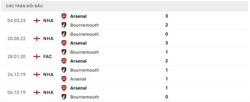 Thành tích đối đầu Bournemouth vs Arsenal: