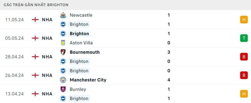 Phong độ gần đây Brighton vs Chelsea