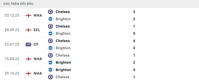 Thành tích đối đầu Brighton vs Chelsea
