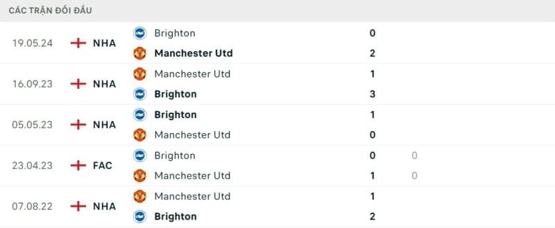 Thành tích đối đầu Brighton vs Man United