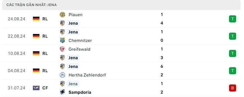 Xét về mặt phong độ, Carl Zeiss Jena đang có màn trình diễn rất ấn tượng. Đoàn quân của HLV Henning Burger hiện có chuỗi 4 trận thắng liên tiếp, ghi được đến 14 bàn thắng. Đây là liều thuốc tinh thần cần thiết để Carl Zeiss Jena tự tin hơn cho cuộc tiếp đón Bayer Leverkusen.