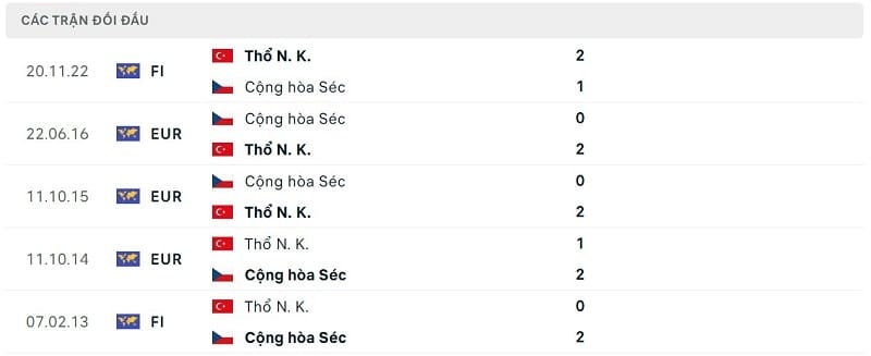 Thành tích đối đầu CH Séc vs Thổ Nhĩ Kỳ