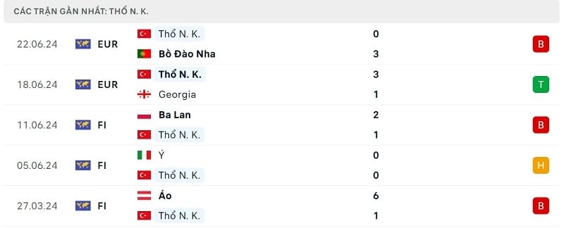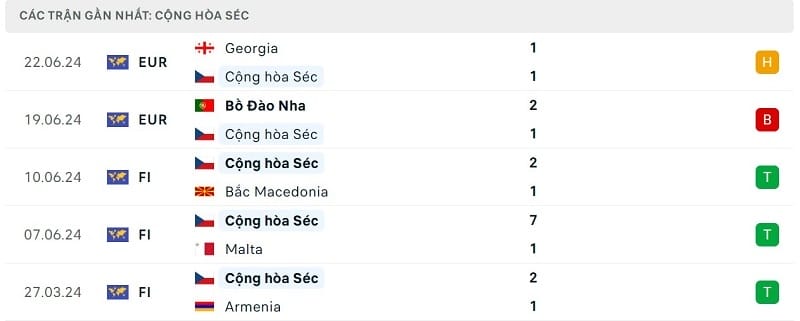 Phong độ gần đây CH Séc vs Thổ Nhĩ Kỳ