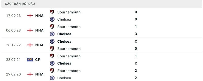 Thành tích đối đầu Chelsea vs Bournemouth