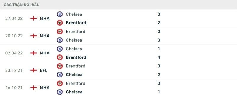 Thành tích đối đầu Chelsea vs Brentford