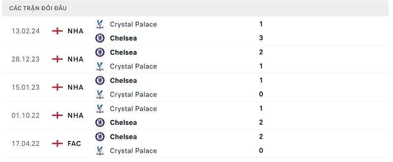 Thành tích đối đầu Chelsea vs Crystal Palace