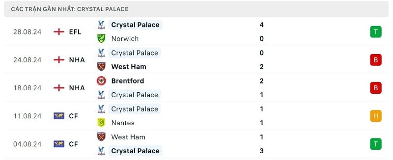 Phong độ gần đây Chelsea vs Crystal Palace