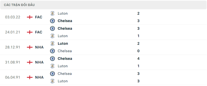 Thành tích đối đầu Chelsea vs Luton